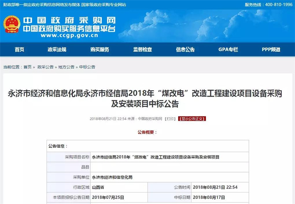 中國政府采購網發布《永濟市經信局2018年“煤改電”改造工程建設項目設備采購及安裝項目中標公告》。中國山西政府采購網發布《稷山縣經信局2018年“煤改電”改造工程建設項目設備及安裝供應商入圍項目中標公告》。