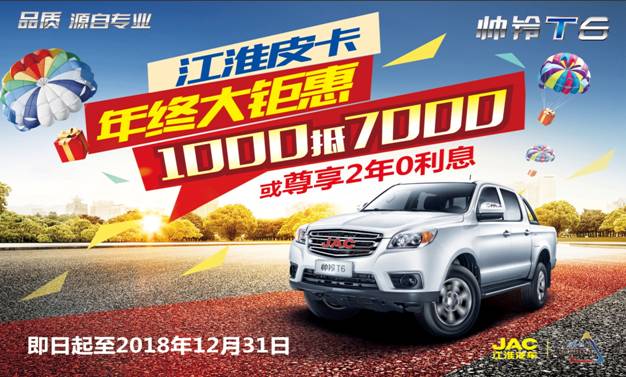 從即日起到12月31日,江淮皮卡年終感恩大回饋,凡購買帥鈴T6全系皮卡即享受交1000元抵7000元年終鉅惠,妥妥的幫你節省一大筆開支。看到如此令人興奮的優惠活動,您是否已經按奈不?。拷雌たǜ嬖V您,選擇不止一種,需要購車貸款的用戶還能選擇3成首付2年零利息的優惠活動,幫您節省近萬元開支,購車從此不再是壓力。