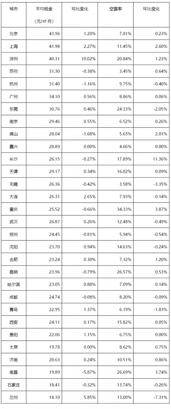 倉庫空置率最高的城市為重慶、南昌、昆明,均超26%。與上月相比,昆明倉庫空置率變化不大;重慶倉儲市場長期處于供大于求狀態(tài),倉庫空置率居高不下,延續(xù)上月上漲趨勢;南昌倉庫資源持續(xù)相對充足,倉庫空置率長期處于高位,加之,1月份部分工廠陸續(xù)停工,導致倉庫租賃需求有所下降,空置率有所上漲。