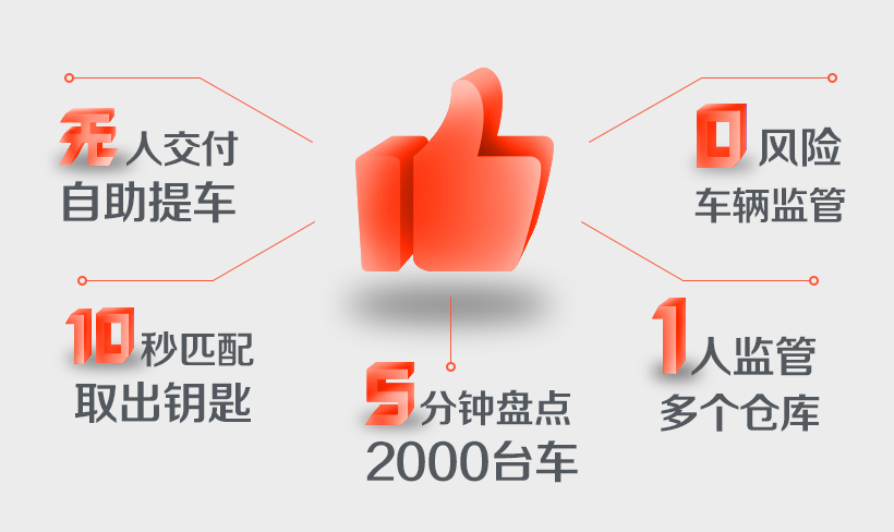 倉配管家覆蓋全國的倉儲資源,全程智能化監管,數據實時在線,使得車輛出入庫、監管和流通都更加安全高效;使得庫內車輛管控能力全方位升級,大幅度降低金融資產的風控成本。在提升倉儲管理效率與服務體驗層面,倉配管家取得了多項行業突破,車輛監管0風險,無人交付自助提車,庫管匹配取出鑰匙只需10秒,1位管理人員就可以遠程監管多個倉庫。