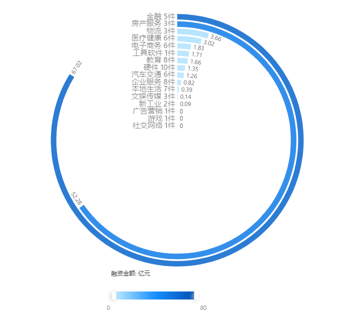 從融資金額來看,金融行業(yè)是融資金額最多的行業(yè)(僅對公開了融資數(shù)據(jù)的事件進行統(tǒng)計),共計67.02億元,其次是房產(chǎn)服務行業(yè),融資金額分別為52.28億元。