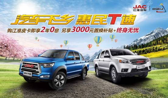 為了響應國家汽車下鄉政策號召,讓廣大皮卡消費者能夠開上放心、可靠、性價比更高的皮卡,江淮皮卡優惠活動再次加碼,特別推出“汽車下鄉 惠民T速”活動。