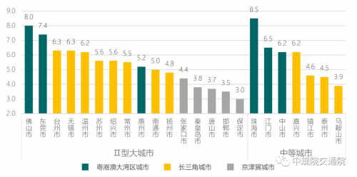 從城市群道路網密度指標來看,呈現“粵港澳大灣區>長三角>京津冀”的明顯特征。去除直轄市、省會、計劃單列市等核心大城市影響,城市群內本次新增監測城市主要為Ⅱ型大城市和中等城市,在此兩類規模城市中,粵港澳大灣區城市道路網密度指標均處于較高水平,其次為長三角城市,京津冀城市道路網密度普遍偏低,全部低于4.5千米/平方千米。就城市道路網密度而言,三大主要城市群中,粵港澳大灣區體現了城市高質量發展的要求,長三角和京津冀分別在追趕全國城市平均水平和北方城市平均水平的道路上仍需快馬加鞭。