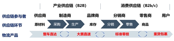 基于上下游位置,供應鏈可分為產業供應鏈(B2B)與消費供應鏈(B2B/B2C)兩大類,映射至物流業則表現為公斤段的差異。從順豐快運升級公告來看,其產品非常全面,從整車直達、大票直送到標準零擔、重貨包裹,主要深耕大件電商及傳統快運業務,可以說已經覆蓋了從原材料到商品的采購、生產、分銷、零售的供應鏈全運輸環節。
