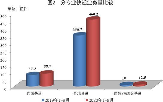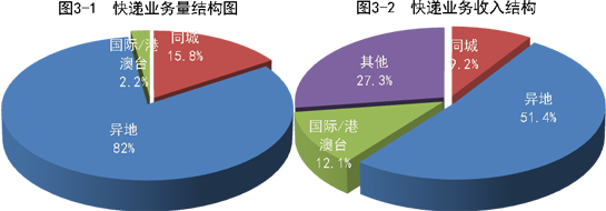 1-9月,同城、異地、國際/港澳臺快遞業(yè)務(wù)量分別占全部快遞業(yè)務(wù)量的15.8%、82%和2.2%;業(yè)務(wù)收入分別占全部快遞收入的9.2%、51.4%和12.1%。與去年同期相比,同城快遞業(yè)務(wù)量的比重下降2個百分點,異地快遞業(yè)務(wù)量的比重上升2.1個百分點,國際/港澳臺業(yè)務(wù)量比重下降0.1個百分點。