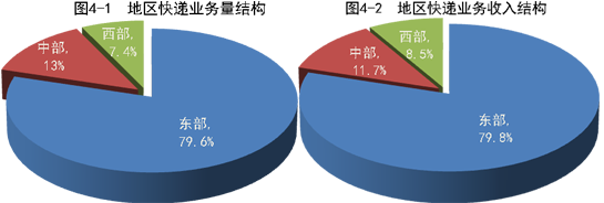 1-9月,東、中、西部地區(qū)快遞業(yè)務(wù)量比重分別為79.6%、13%和7.4%,業(yè)務(wù)收入比重分別為79.8%、11.7%和8.5%。與去年同期相比,東部地區(qū)快遞業(yè)務(wù)量比重下降0.3個百分點,快遞業(yè)務(wù)收入比重下降0.6個百分點;中部地區(qū)快遞業(yè)務(wù)量比重上升0.4個百分點,快遞業(yè)務(wù)收入比重上升0.6個百分點;西部地區(qū)快遞業(yè)務(wù)量比重下降0.1個百分點,快遞業(yè)務(wù)收入比重基本持平。