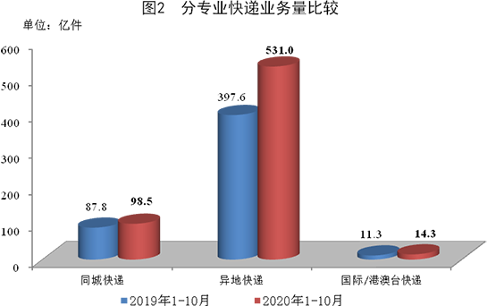 1-10月,同城、異地、國際/港澳臺快遞業(yè)務(wù)量分別占全部快遞業(yè)務(wù)量的15.3%、82.5%和2.2%;業(yè)務(wù)收入分別占全部快遞收入的9%、51.5%和12.1%。與去年同期相比,同城快遞業(yè)務(wù)量的比重下降2.4個百分點,異地快遞業(yè)務(wù)量的比重上升2.5個百分點,國際/港澳臺業(yè)務(wù)量比重下降0.1個百分點。