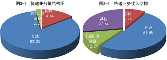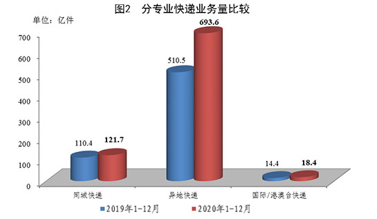 2020年,同城、異地、國際/港澳臺快遞業務量分別占全部快遞業務量的14.6%、83.2%和2.2%;業務收入分別占全部快遞收入的8.7%、51.5%和12.2%。與去年同期相比,同城快遞業務量的比重下降2.8個百分點,異地快遞業務量的比重上升2.8個百分點,國際/港澳臺業務量的比重基本持平。