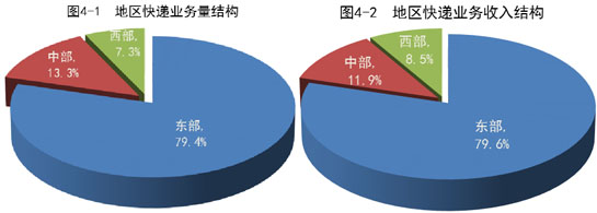 2020年,東、中、西部地區快遞業務量比重分別為79.4%、13.3%和7.3%,業務收入比重分別為79.6%、11.9%和8.5%。與去年同期相比,東部地區快遞業務量比重下降0.3個百分點,快遞業務收入比重下降0.6個百分點;中部地區快遞業務量比重上升0.4個百分點,快遞業務收入比重上升0.6個百分點;西部地區快遞業務量比重下降0.1個百分點,快遞業務收入比重基本持平。