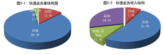 1月份,同城、異地、國際/港澳臺(tái)快遞業(yè)務(wù)量分別占全部快遞業(yè)務(wù)量的12.4%、85.4%和2.2%;業(yè)務(wù)收入分別占全部快遞收入的7.9%、51.9%和11.8%。與去年同期相比,同城快遞業(yè)務(wù)量的比重下降5.2個(gè)百分點(diǎn),異地快遞業(yè)務(wù)量的比重上升5.9個(gè)百分點(diǎn),國際/港澳臺(tái)業(yè)務(wù)量的比重下降0.7個(gè)百分點(diǎn)。