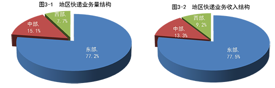 1月份,東、中、西部地區(qū)快遞業(yè)務(wù)量比重分別為77.2%、15.1%和7.7%,業(yè)務(wù)收入比重分別為77.5%、13.3%和9.2%。與去年同期相比,東部地區(qū)快遞業(yè)務(wù)量比重下降2.4個(gè)百分點(diǎn),快遞業(yè)務(wù)收入比重下降2.3個(gè)百分點(diǎn);中部地區(qū)快遞業(yè)務(wù)量比重上升2.9個(gè)百分點(diǎn),快遞業(yè)務(wù)收入比重上升2.4個(gè)百分點(diǎn);西部地區(qū)快遞業(yè)務(wù)量比重下降0.5個(gè)百分點(diǎn),快遞業(yè)務(wù)收入比重下降0.1個(gè)百分點(diǎn)。
