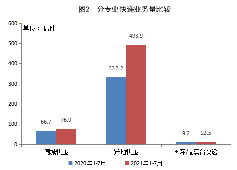 1-7月,全國快遞服務(wù)企業(yè)業(yè)務(wù)量累計(jì)完成583.3億件,同比增長42.9%;業(yè)務(wù)收入累計(jì)完成5669.4億元,同比增長24.7%。其中,同城業(yè)務(wù)量累計(jì)完成76.9億件,同比增長15.2%;異地業(yè)務(wù)量累計(jì)完成493.9億件,同比增長48.7%;國際/港澳臺(tái)業(yè)務(wù)量累計(jì)完成12.5億件,同比增長35.7%。