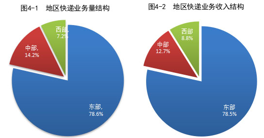 1-7月,東、中、西部地區(qū)快遞業(yè)務(wù)量比重分別為78.6%、14.2%和7.2%,業(yè)務(wù)收入比重分別為78.5%、12.7%和8.8%。與去年同期相比,東部地區(qū)快遞業(yè)務(wù)量比重下降1.4個(gè)百分點(diǎn),快遞業(yè)務(wù)收入比重下降1.5個(gè)百分點(diǎn);中部地區(qū)快遞業(yè)務(wù)量比重上升1.5個(gè)百分點(diǎn),快遞業(yè)務(wù)收入比重上升1.2個(gè)百分點(diǎn);西部地區(qū)快遞業(yè)務(wù)量比重下降0.1個(gè)百分點(diǎn),快遞業(yè)務(wù)收入比重上升0.3個(gè)百分點(diǎn)。