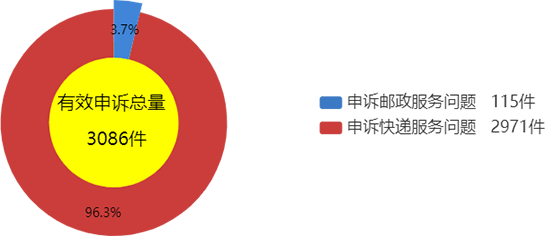 2.受理的申訴中有效申訴(確定企業(yè)責(zé)任的)為3086件,環(huán)比增長10.4%,同比增長106.4%。有效申訴中涉及郵政服務(wù)問題的115件,占有效申訴量的3.7%,環(huán)比增長12.7%,同比增長94.9%;涉及快遞服務(wù)問題的2971件,占有效申訴量的96.3%,環(huán)比增長10.3%,同比增長106.9%。
