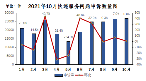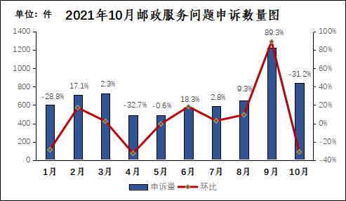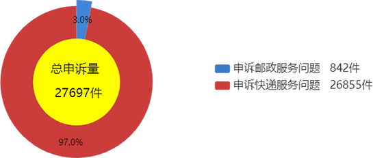 1.2021年10月,國家郵政局和各省(區(qū)、市)郵政管理局通過“12305”郵政業(yè)用戶申訴電話和申訴網(wǎng)站共處理申訴27697件,環(huán)比下降0.6%,同比增長57.1%。申訴中涉及郵政服務(wù)問題的842件,占總申訴量的3%,環(huán)比下降31.2%,同比增長64.1%;涉及快遞服務(wù)問題的26855件,占總申訴量的97%,環(huán)比增長0.8%,同比增長56.9%。