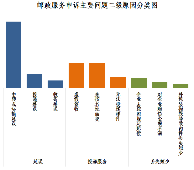 郵件延誤申訴中主要占比是中轉(zhuǎn)或運(yùn)輸延誤,投遞服務(wù)申訴中主要占比是虛假簽收,郵件丟失短少申訴中主要占比是企業(yè)未按照規(guī)定賠償。