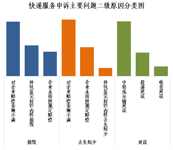 快件損毀申訴中主要占比是對企業(yè)賠償金額不滿,快件丟失短少申訴中主要占比是對企業(yè)賠償金額不滿,快件延誤申訴中主要占比是中轉(zhuǎn)或運(yùn)輸延誤。