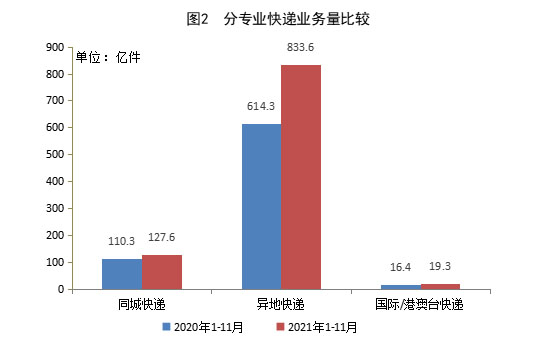 1-11月,全國快遞服務企業業務量累計完成980.5億件,同比增長32.3%;業務收入累計完成9414.7億元,同比增長19.6%。其中,同城業務量累計完成127.6億件,同比增長15.7%;異地業務量累計完成833.6億件,同比增長35.7%;國際/港澳臺業務量累計完成19.3億件,同比增長17.4%。