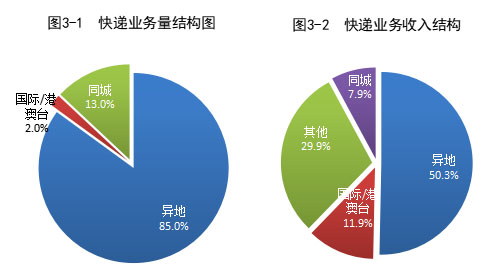 1-11月,同城、異地、國際/港澳臺快遞業務量分別占全部快遞業務量的13%、85%和2%;業務收入分別占全部快遞業務收入的7.9%、50.3%和11.9%。與去年同期相比,同城快遞業務量的比重下降1.9個百分點,異地快遞業務量的比重上升2.1個百分點,國際/港澳臺業務量的比重下降0.2個百分點。