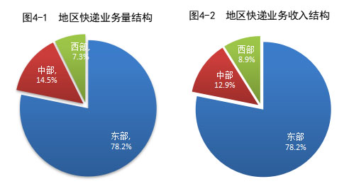 1-11月,東、中、西部地區快遞業務量比重分別為78.2%、14.5%和7.3%,業務收入比重分別為78.2%、12.9%和8.9%。與去年同期相比,東部地區快遞業務量比重下降1.3個百分點,快遞業務收入比重下降1.5個百分點;中部地區快遞業務量比重上升1.3個百分點,快遞業務收入比重上升1.1個百分點;西部地區快遞業務量比重基本持平,快遞業務收入比重上升0.4個百分點。