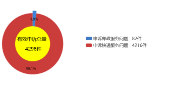 2.受理的申訴中有效申訴(確定企業責任的)為4298件,環比增長3.5%,同比增長112.1%。有效申訴中涉及郵政服務問題的82件,占有效申訴量的1.9%,環比下降11.8%,同比增長32.3%;涉及快遞服務問題的4216件,占有效申訴量的98.1%,環比增長3.8%,同比增長114.7%。