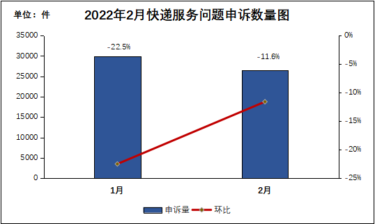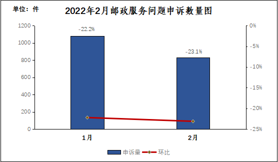 1.2022年2月,國家郵政局和各省(區、市)郵政管理局通過“12305”郵政業用戶申訴電話和申訴網站共處理申訴27335件,環比下降12%,同比增長46.1%。申訴中涉及郵政服務問題的828件,占總申訴量的3%,環比下降23.1%,同比增長16.5%;涉及快遞服務問題的26507件,占總申訴量的97%,環比下降11.6%,同比增長47.2%。