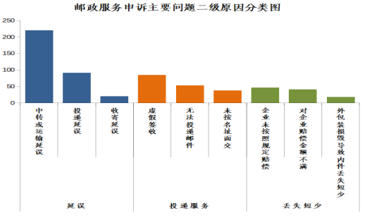 郵件延誤申訴中主要占比是中轉或運輸延誤,投遞服務申訴中主要占比是虛假簽收,郵件丟失短少申訴中主要占比是企業未按照規定賠償。