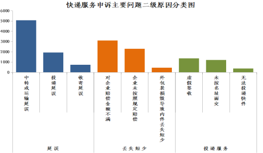 快件延誤申訴中主要占比是中轉或運輸延誤,快件丟失短少申訴中主要占比是對企業賠償金額不滿,投遞服務申訴中主要占比是虛假簽收。