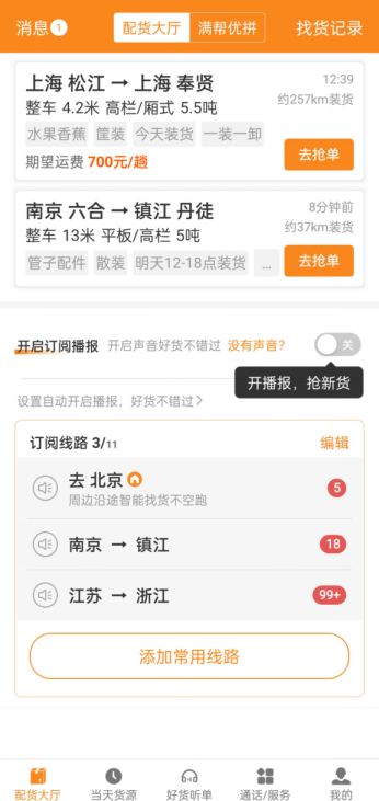 以南京-北京為例,通過“一鍵掃貨”功能,司機能額外看到南京周邊到北京、南京到北京周邊、南京周邊到北京周邊、南京出發到連云港裝貨送往北京的貨源