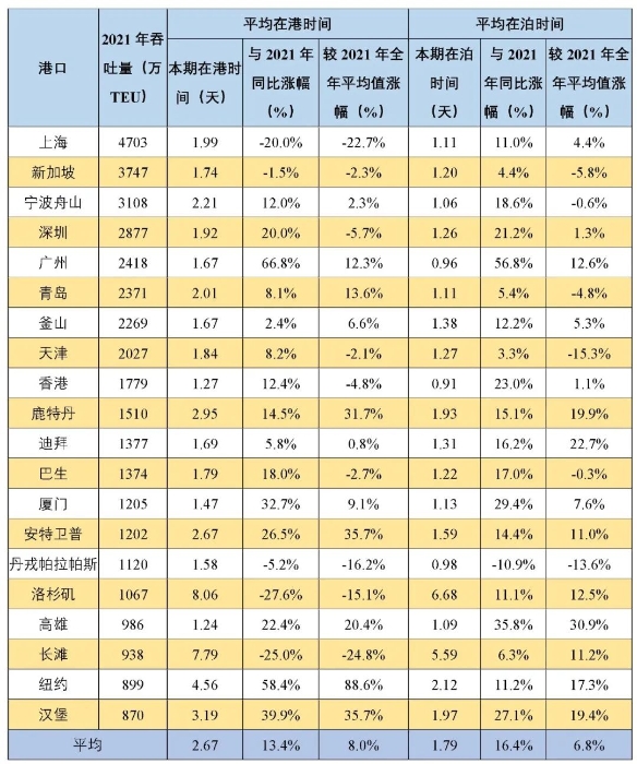 全球集裝箱吞吐量前20大港口中,中國占9席,分別為上海港、寧波舟山港、深圳港、廣州港、青島港、天津港、香港港、廈門港、高雄港。數(shù)據(jù)顯示,一季度,中國港口船舶平均在港時(shí)間、在泊時(shí)間分別為1.74天、1.10天,與2021年中國港口全年平均值基本持平,明顯優(yōu)于其他11個(gè)國外主要港口平均水平的3.43天、2.36天。其中,上海港船舶平均在港時(shí)間為1.99天,較2021年下降22.7%。