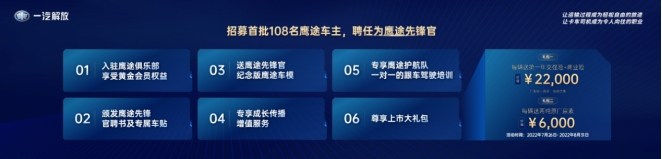 同時(shí),為了最大程度的回饋厚愛與支持,解放鷹途面向首批客戶,在線上線下全面開啟了“108名鷹途先鋒官”招募活動(dòng)。前108名鷹途車主,將成為鷹途先鋒官,不僅可以直接入駐鷹途俱樂部,享受黃金會(huì)員權(quán)益,還將授予其鷹途先鋒官聘書及專屬車貼;每位先鋒官均可獲贈(zèng)紀(jì)念版鷹途車模一個(gè),并專享成長(zhǎng)傳播增值服務(wù)、鷹途護(hù)航隊(duì)一對(duì)一的跟車駕駛培訓(xùn)。在2022年7月26日- 8月31日上市期間購買鷹途的車主,還將尊享鷹途上市限量大禮包,即每輛鷹途可獲得第一年價(jià)值22000元的交強(qiáng)險(xiǎn)、商業(yè)險(xiǎn),并享有續(xù)保優(yōu)惠,以及價(jià)值6000元的兩噸原廠尿素等兩大超值福利。