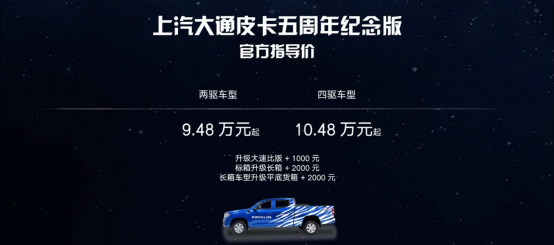恰逢上汽大通MAXUS皮卡五周年之際,隨著五周年紀念版皮卡車型的加入,上汽大通MAXUS也將以更完整的皮卡家族體系,多方面滿足皮卡用戶需求,為皮卡車市注入強動能,引領未來皮卡出行新潮流。作為上汽大通MAXUS五星時尚皮卡,五周年紀念版皮卡車型不僅是一輛工具車,它更是一輛有里有面的全能型皮卡。新車共推出兩種驅動款式車型,兩驅車型起售價9.48萬元,四驅車型起售價10.48萬元。