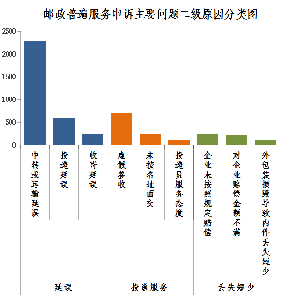 2.郵政普遍服務申訴主要問題二級原因情況。郵件延誤申訴中主要占比較多的是中轉或運輸延誤,投遞服務申訴中主要占比較多的是虛假簽收,郵件丟失短少申訴中主要占比較多的是企業未按照規定賠償。