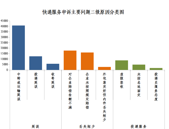 1.快遞服務申訴問題數量與類別情況。用戶對快遞服務問題申訴162819件,其中有效申訴28705件,涉及的主要問題依次是快件延誤、快件丟失短少和投遞服務,分別占有效申訴總量的35.7%、32.5%和19.2%。