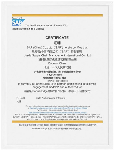 在SAP生態合作伙伴體系中,對于合作伙伴有著完善且嚴格的考核體系,需要從企業實力、技術能力、解決方案能力等各方面進行綜合的考核,綜合達標后才能授予認證。本次認證是對準時達以及JusLink智慧供應鏈實進協同平臺實力及力能力的見證,也是對準時達在企業數字化轉型領域強大實力的充分肯定。