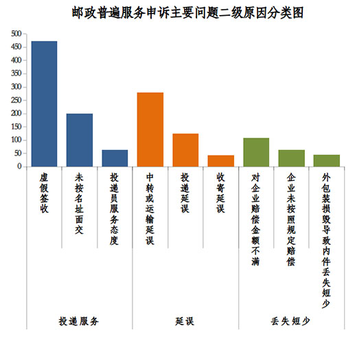 2.郵政普遍服務申訴主要問題二級原因情況。投遞服務申訴中主要占比較多的是虛假簽收,郵件延誤申訴中主要占比較多的是中轉或運輸延誤,郵件丟失短少申訴中主要占比較多的是對企業賠償金額不滿。