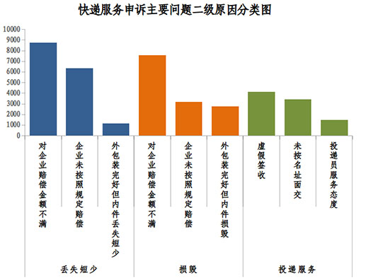 2.快遞服務申訴主要問題二級原因情況。快件丟失短少申訴中主要占比較多的是對企業賠償金額不滿,快件損毀申訴中主要占比較多的是對企業賠償金額不滿,投遞服務申訴中主要占比較多的是虛假簽收。
