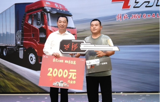 ▲一汽解放銷售公司副總經理霍明為J6V 530馬力LNG牽引車客戶頒發交車鑰匙