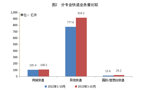 1-10月,同城快遞業務量累計完成108.3億件,同比增長2.7%;異地快遞業務量累計完成919.2億件,同比增長18.2%;國際/港澳臺快遞業務量累計完成24.2億件,同比增長55.1%。