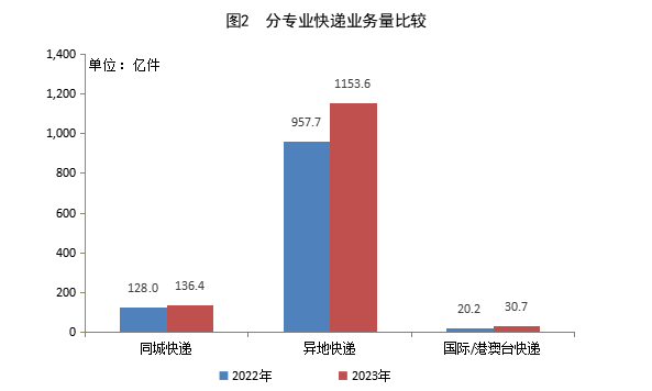 2023年,同城快遞業務量累計完成136.4億件,同比增長6.6%;異地快遞業務量累計完成1153.6億件,同比增長20.5%;國際/港澳臺快遞業務量累計完成30.7億件,同比增長52.0%。