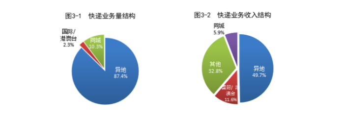 2023年,同城、異地、國際/港澳臺快遞業務量分別占全部快遞業務量的10.3%、87.4%和2.3%;業務收入分別占全部快遞收入的5.9%、49.7%和11.6%。與去年同期相比,同城快遞業務量的比重下降1.3個百分點,異地快遞業務量的比重上升0.8個百分點,國際/港澳臺業務量的比重上升0.5個百分點。