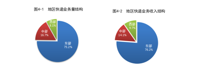 2023年,東、中、西部地區快遞業務量比重分別為75.2%、16.7%和8.1%,業務收入比重分別為76.2%、14.1%和9.7%。與去年同期相比,東部地區快遞業務量比重下降1.6個百分點,快遞業務收入比重下降1.4個百分點;中部地區快遞業務量比重上升1.0個百分點,快遞業務收入比重上升0.7個百分點;西部地區快遞業務量比重上升0.6個百分點,快遞業務收入比重上升0.7個百分點。
