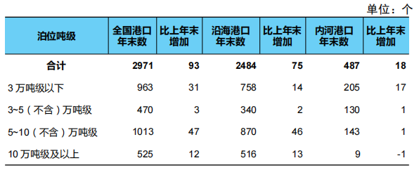 年末全國港口萬噸級及以上泊位2971個,比上年末增加93個。從分布結構看,內(nèi)河港口萬噸級及以上泊位487個、增加18個,沿海港口萬噸級及以上泊位2484個、增加75個。從用途結構看,專業(yè)化萬噸級及以上泊位1579個、增加35個,通用散貨萬噸級及以上泊位698個、增加34個,通用件雜貨萬噸級及以上泊位463個、增加16個,客貨萬噸級及以上泊位3個、與去年持平,多用途萬噸級及以上泊位193個、增加10個。?