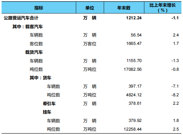 年末全國擁有公路營運汽車1212.24萬輛。分結構看,擁有載客汽車56.54萬輛、1665.47萬客位,比上年末分別增加1.30萬輛、27.18萬客位;擁有載貨汽車1155.70萬輛、17082.56萬噸位,分別減少15.27萬輛、134.15萬噸位,其中,普通貨車325.15萬輛、4037.73萬噸位,分別減少33.55萬輛、396.78萬噸位,專用貨車72.02萬輛、786.39萬噸位,分別增加3.33萬輛、減少31.35萬噸位,牽引車378.61萬輛、增加8.23萬輛,掛車379.92萬輛、增加6.72萬輛。