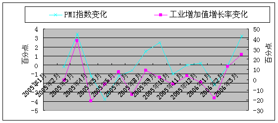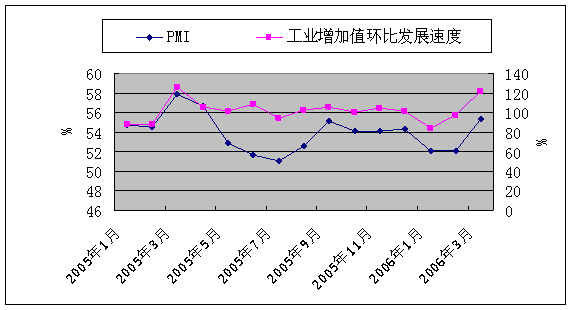 圖4.4 2005年1月-2006年3月PMI指數與工業增加值環比發展速度比較