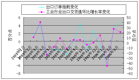 圖4.8 出口訂單指數變化與工業行業出口交貨值環比增長率變化比較