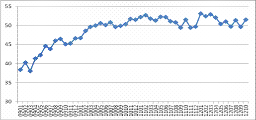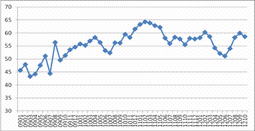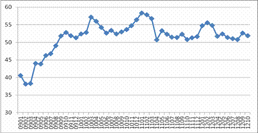 2009年1月—2012年10月全球服務(wù)業(yè)新訂單指數(shù)
